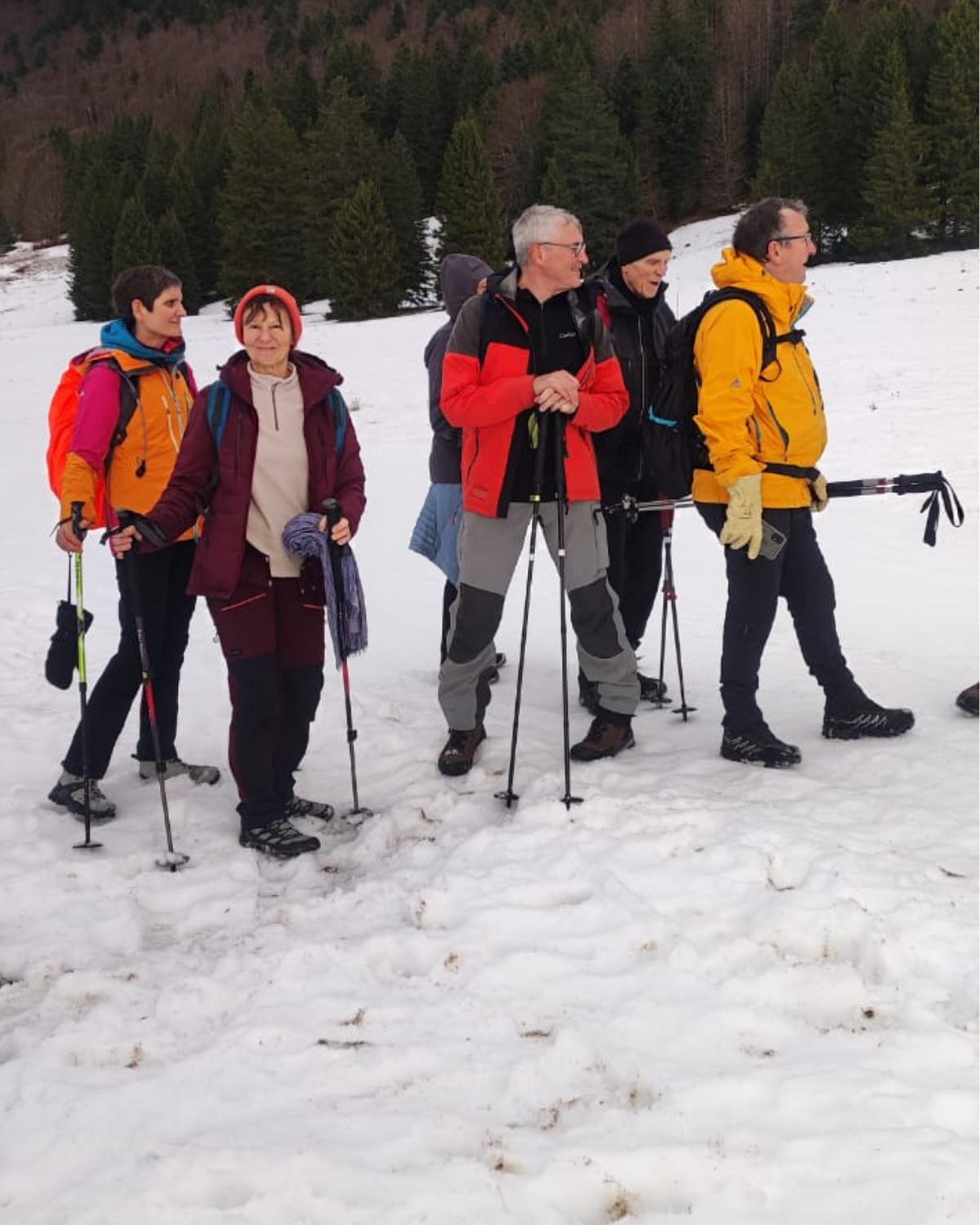 Ici sur la photo, le pas Ernadant est à droite, mais le groupe des randonneurs en raquettes est parti en direction du col à gauche ; trop déportés sur la gauche, dans une neige dans laquelle les raquettes enfonçaient beaucoup, ils ont dû faire demi-tour. Pendant ce temps-là, j’ai déjeuné avec Olivier, Amel, Maryse et Jean-Patrick puis nous avons marché un peu avec les raquettes car il commençait à faire frais.