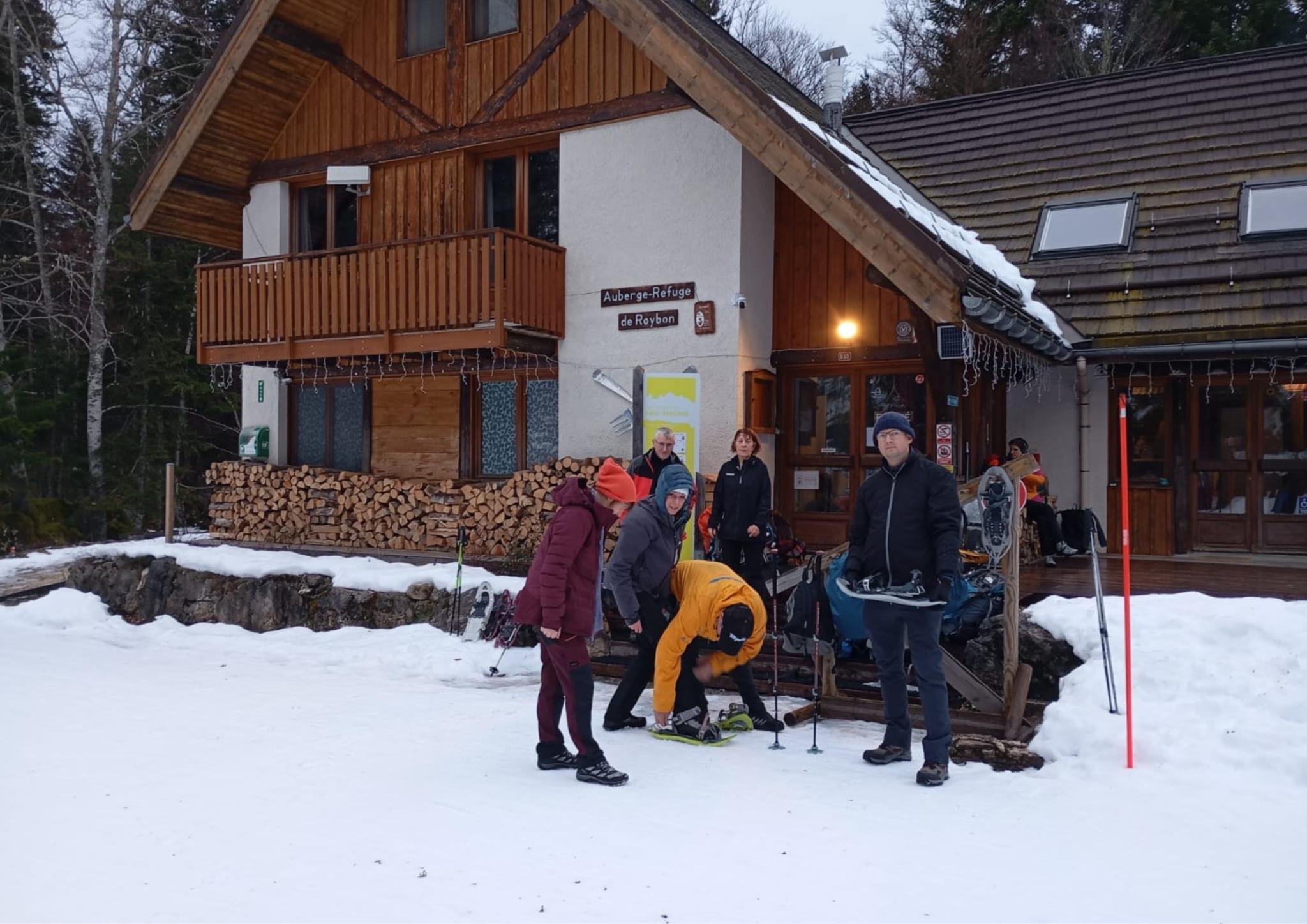 Situé à 500 mètres du parking, nous y sommes parvenus en un quart d’heure et, après avoir fait connaissance avec les propriétaires, Christelle et Emmanuel, qui ont été très accueillants, nous avons ensuite laissé les raquettes et les bâtons à l’extérieur du refuge, rangé les chaussures dans des casiers, déposé les sacs à dos dans le dortoir, puis pris une douche et, enfin, bu une bonne bière.
