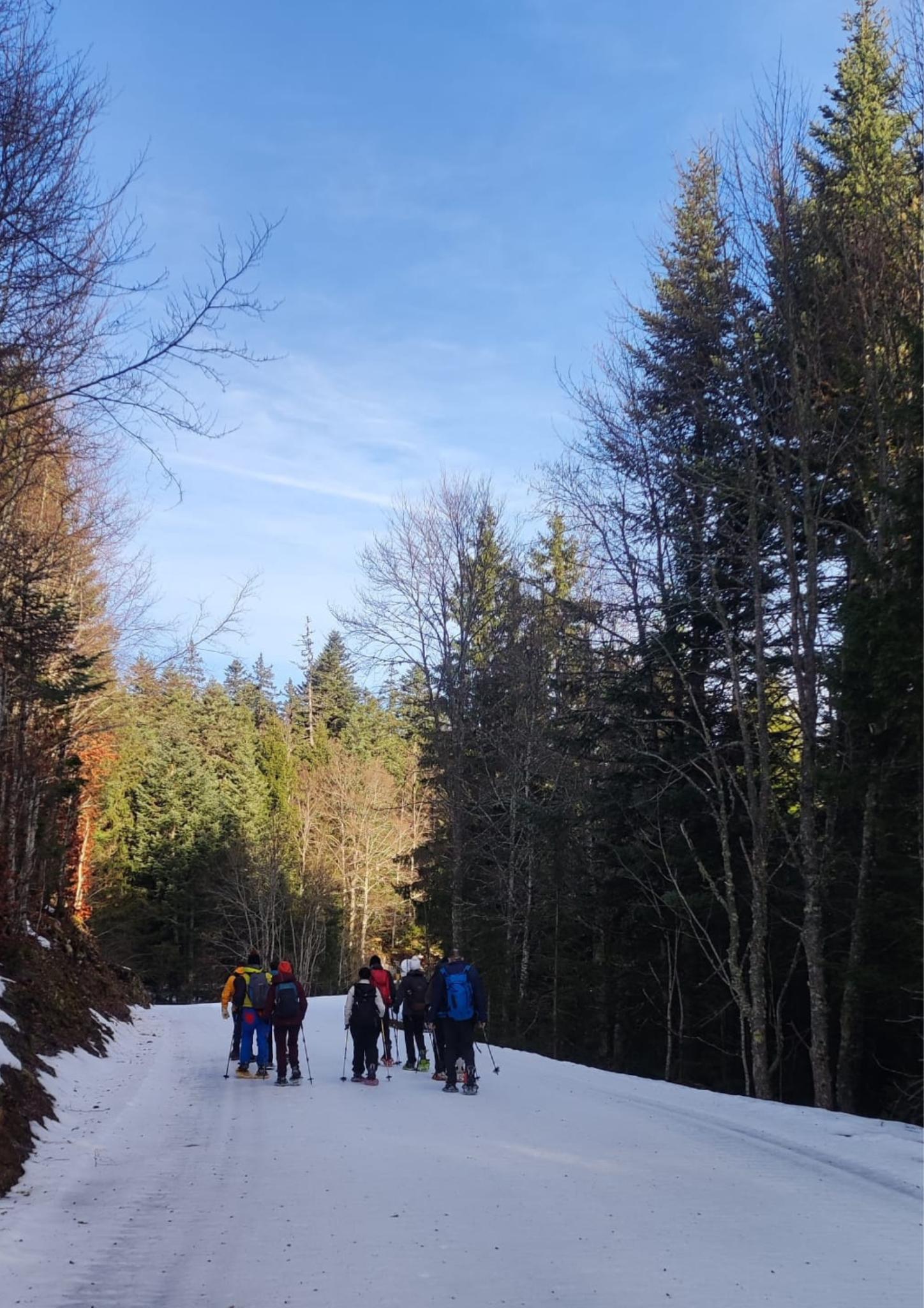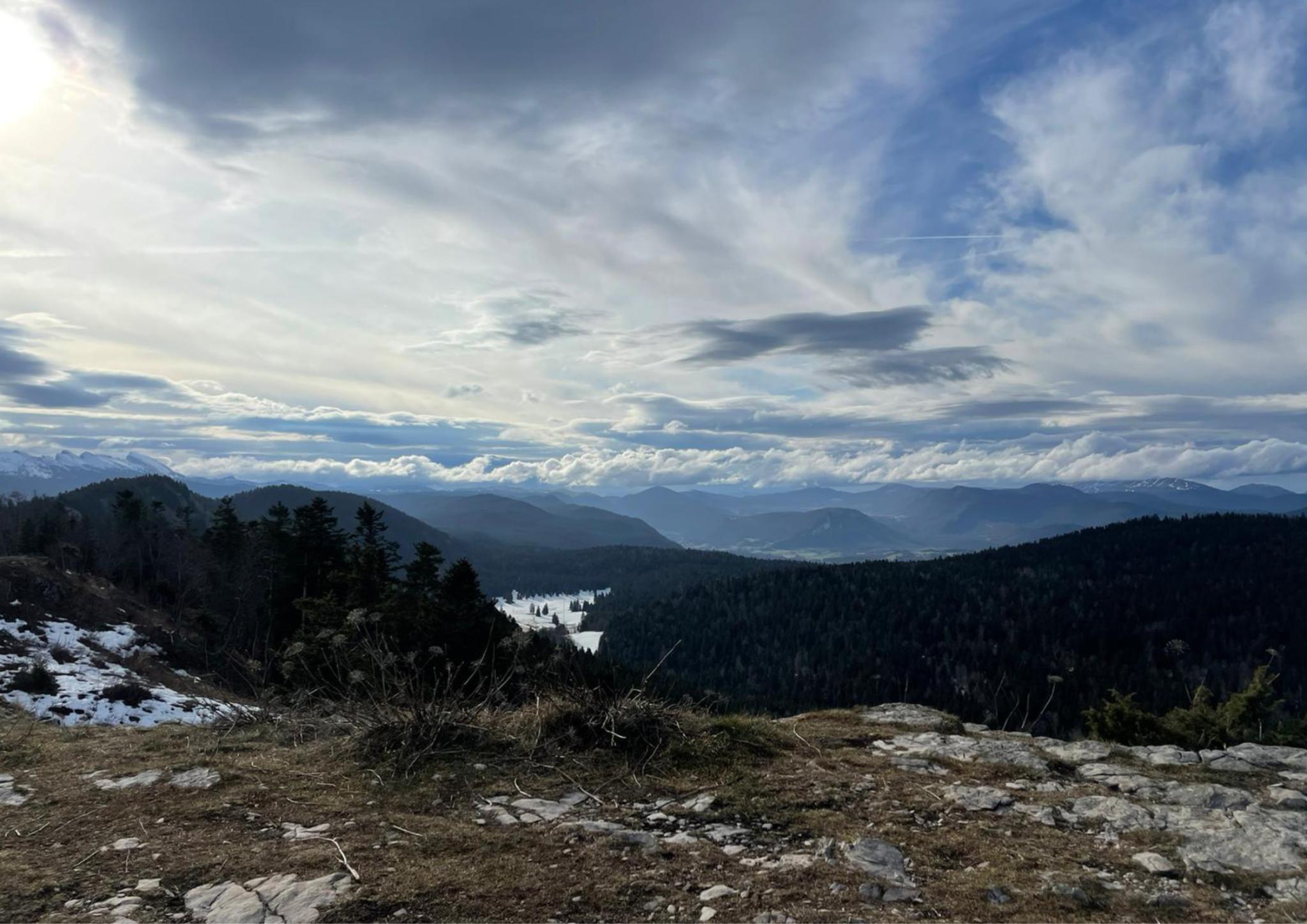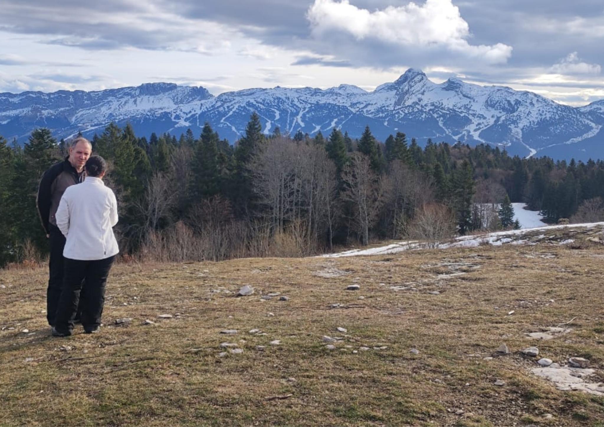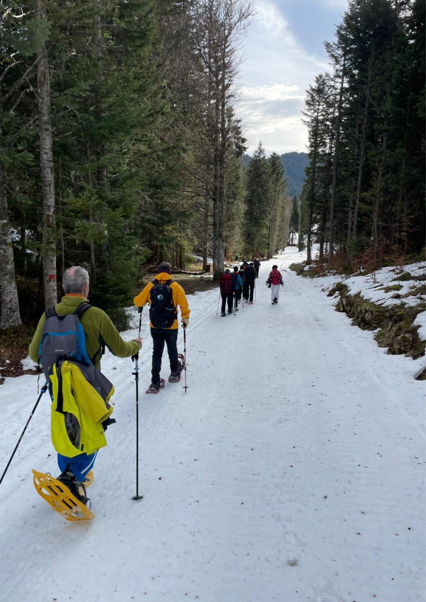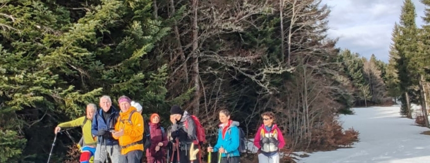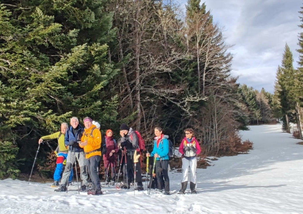 Le lendemain donc, nous sommes repartis vers le belvédère de Chateau-Julien,à 1560 m d’altitude. Nous avons appris qu’il y avait des gouffres dans la forêt, des endroits où le sol s’était effondré sur plusieurs dizaines de mètres. La plaine d’Herbouilly était recouverte de neige. Nous avons dû chausser les raquettes à plusieurs reprises, et, au bout de deux heures de marche, nous sommes arrivés au belvédère pour y faire une pause.