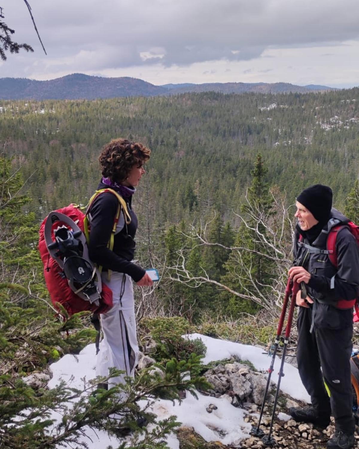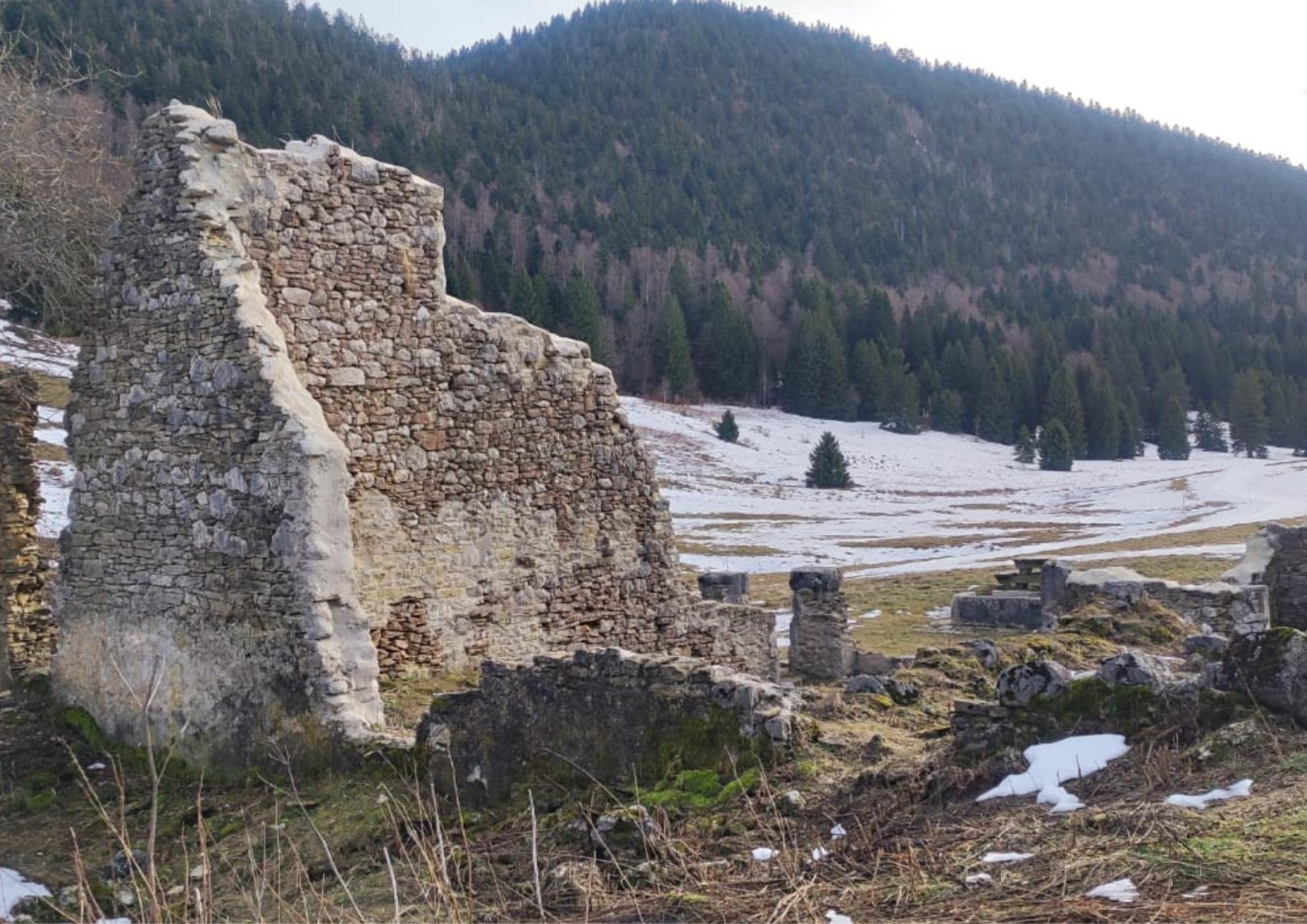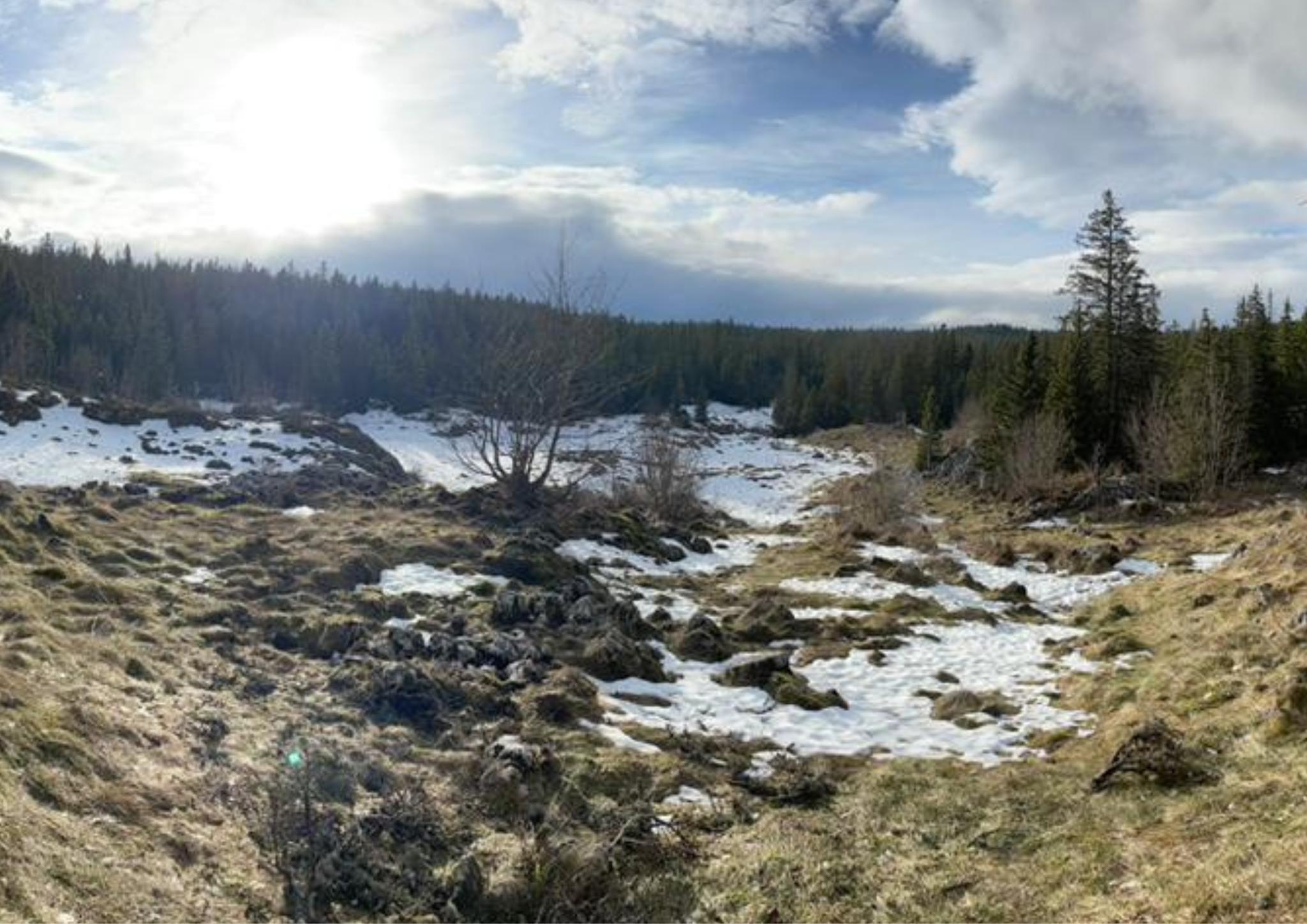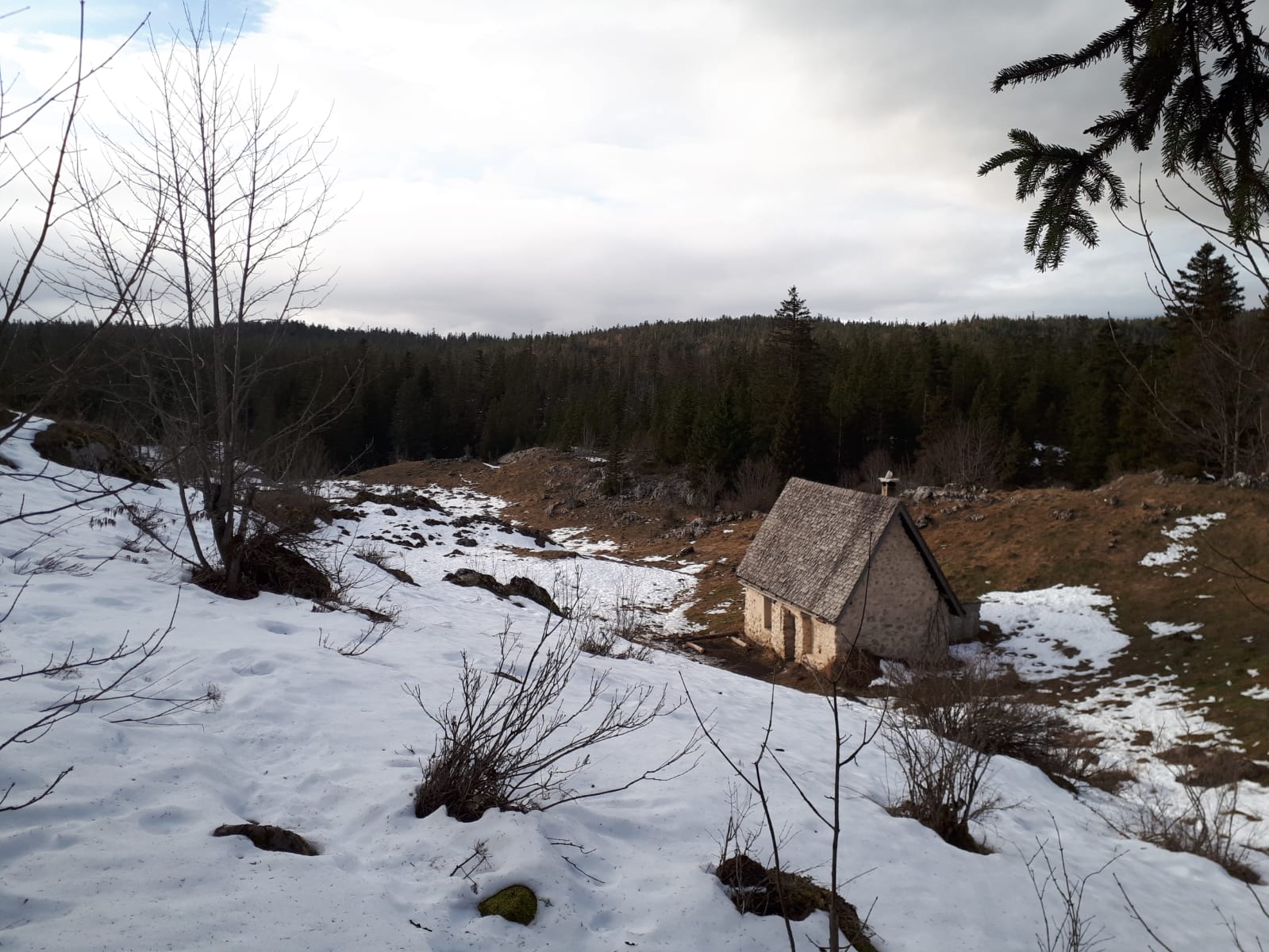 Le lendemain donc, nous sommes repartis vers le belvédère de Chateau-Julien,à 1560 m d’altitude. Nous avons appris qu’il y avait des gouffres dans la forêt, des endroits où le sol s’était effondré sur plusieurs dizaines de mètres. La plaine d’Herbouilly était recouverte de neige. Nous avons dû chausser les raquettes à plusieurs reprises, et, au bout de deux heures de marche, nous sommes arrivés au belvédère pour y faire une pause.