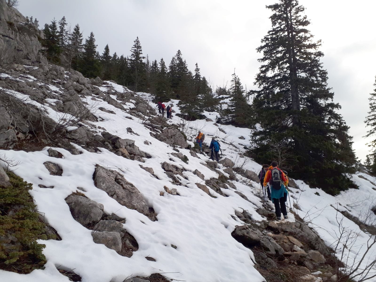 Après une demi-heure, le second groupe, emmené par Laurence, est redescendu et nous avons entamé le chemin du retour vers le refuge du Roybon. Le chemin était un peu accidenté et Laurence est restée un peu en arrière avec Amel, pour qui c’était la première sortie en montagne et qui n’avait pas prévu la difficulté de la descente dans les pierriers enneigés.