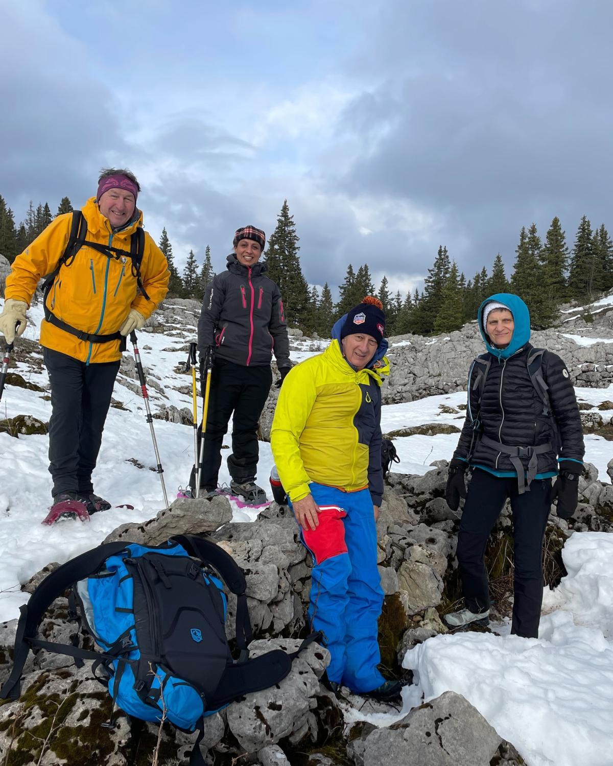 En progressant vers le pas Ernadant, le chemin s’est fait plus compliqué et nous avons dû chausser les raquettes. Photo prise par Jean-François, avec Laurence et Gérard sur la photo.