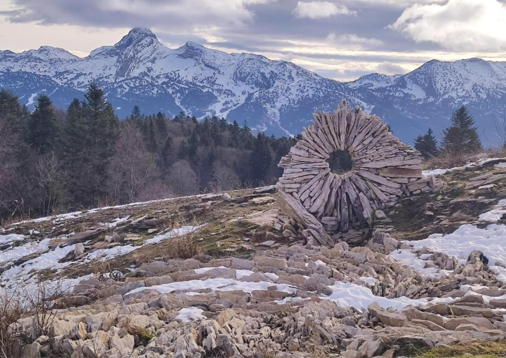 Une oeuvre artistique surplombe la plaine et, dans le trou, on peut apercevoir la Grande Moucherolle, à 2284 m.